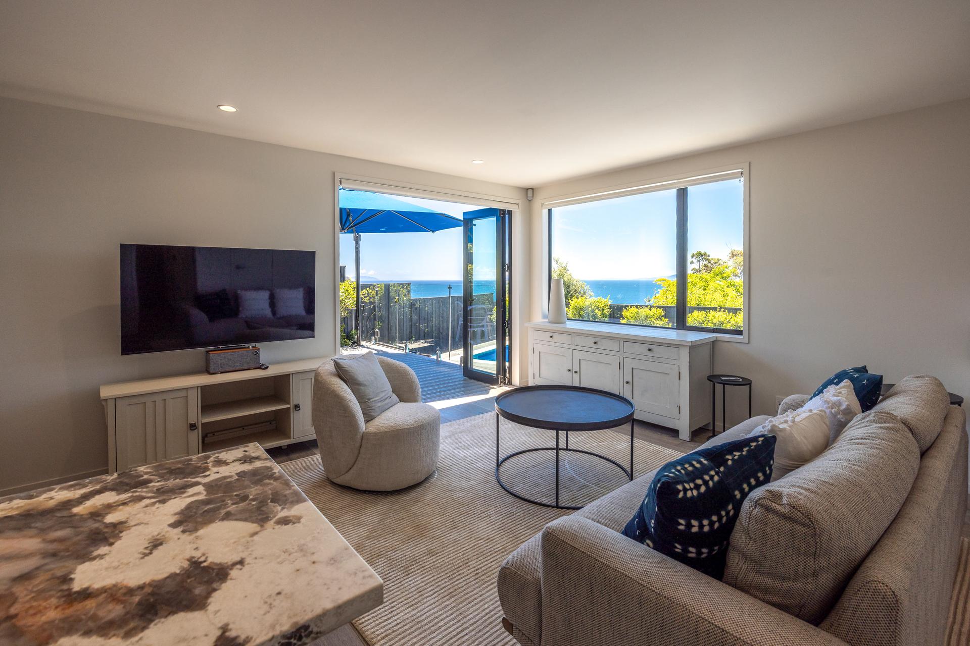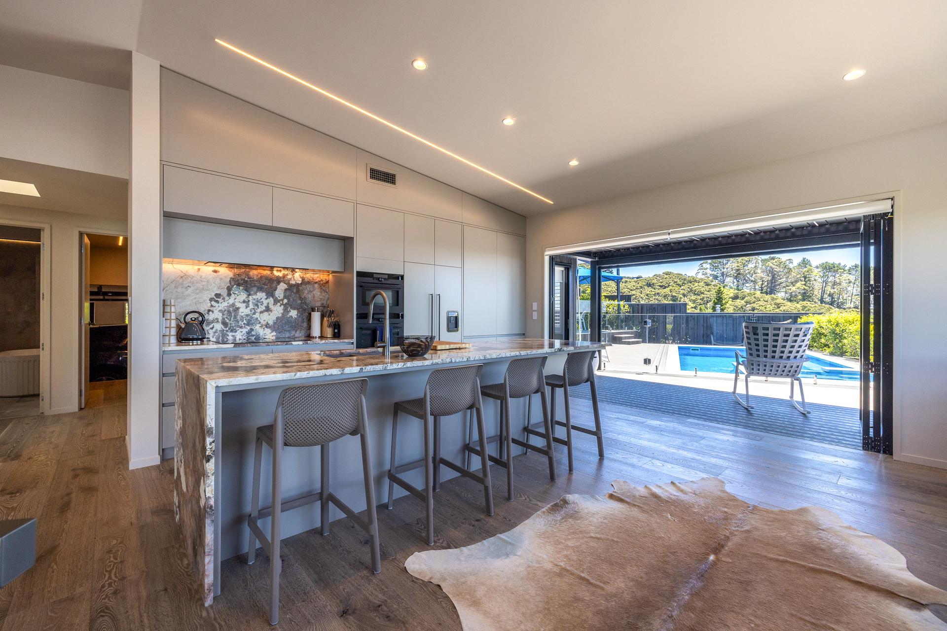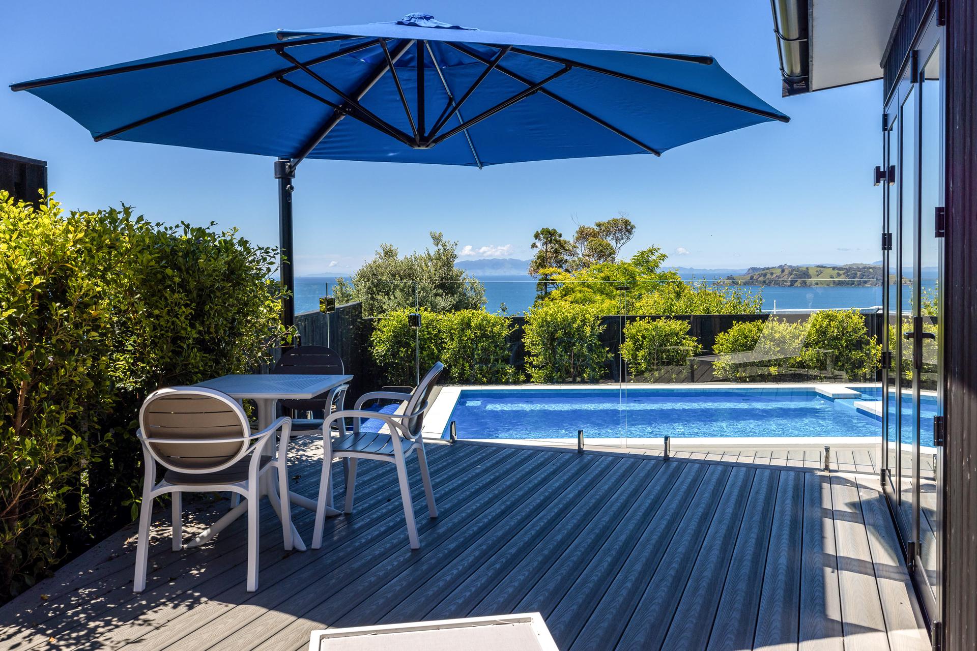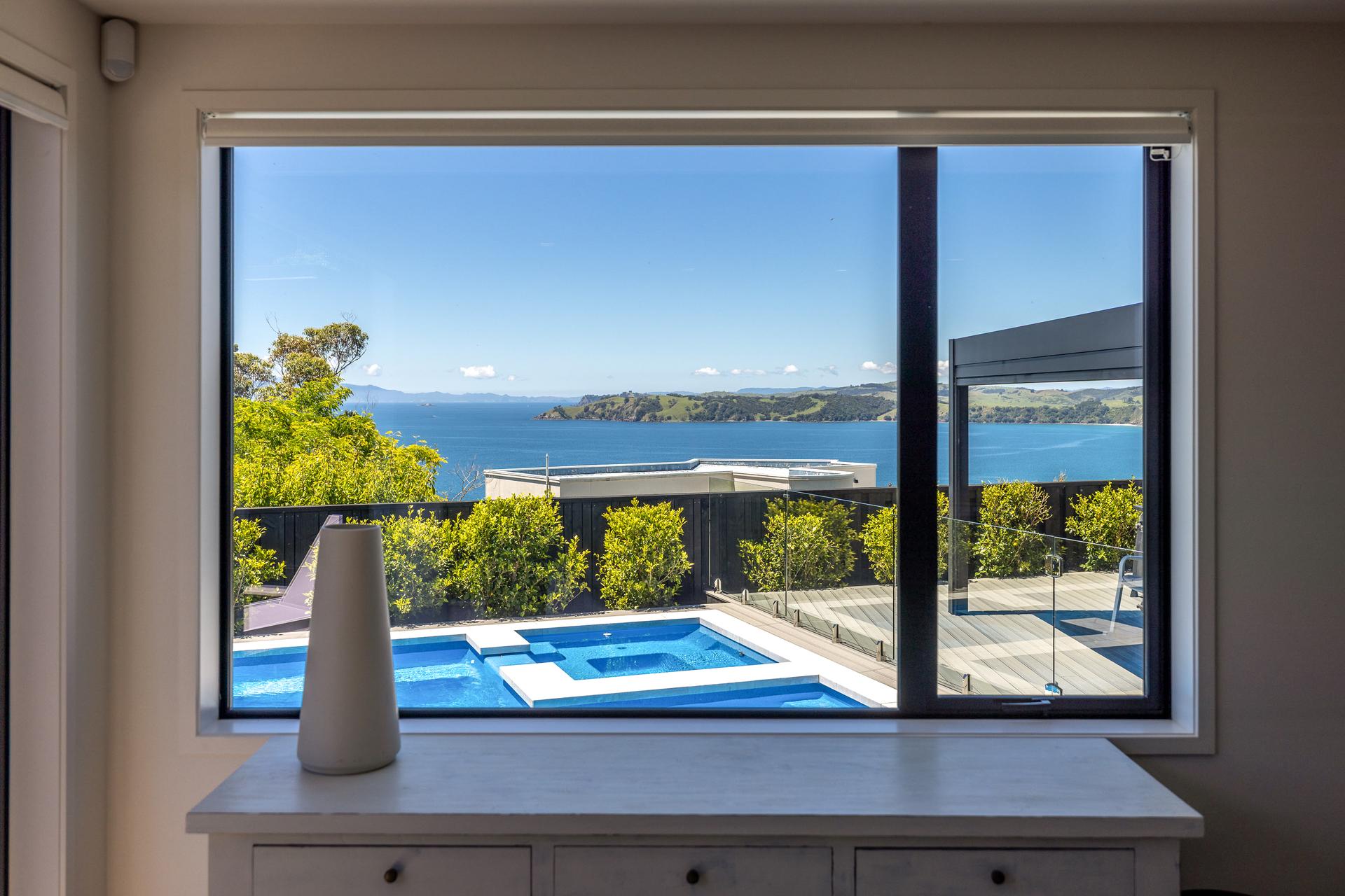 Set high above Sea View Road at the end of a sweeping private drive, this brand-new property is an oasis of contemporary luxury. As you walk into the main living areas, you are met with uninterrupted views stretching from Onetangi Beach to the Coromandel and Great Barrier Island, as well as back across the rolling vineyards of Waiheke.