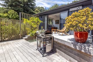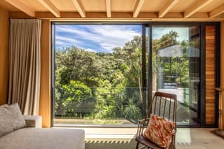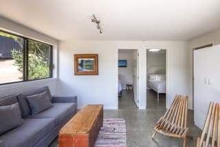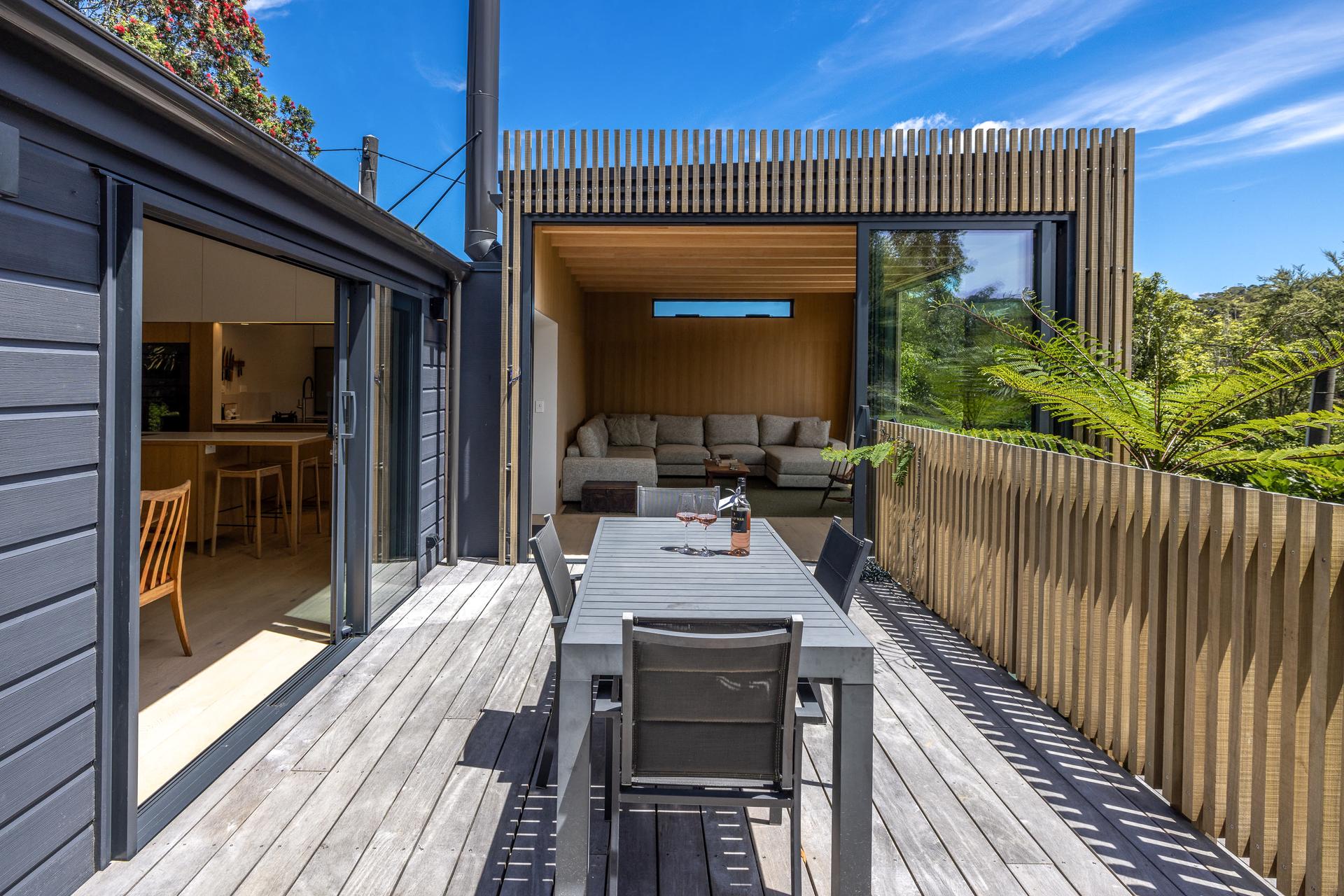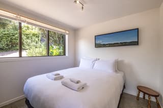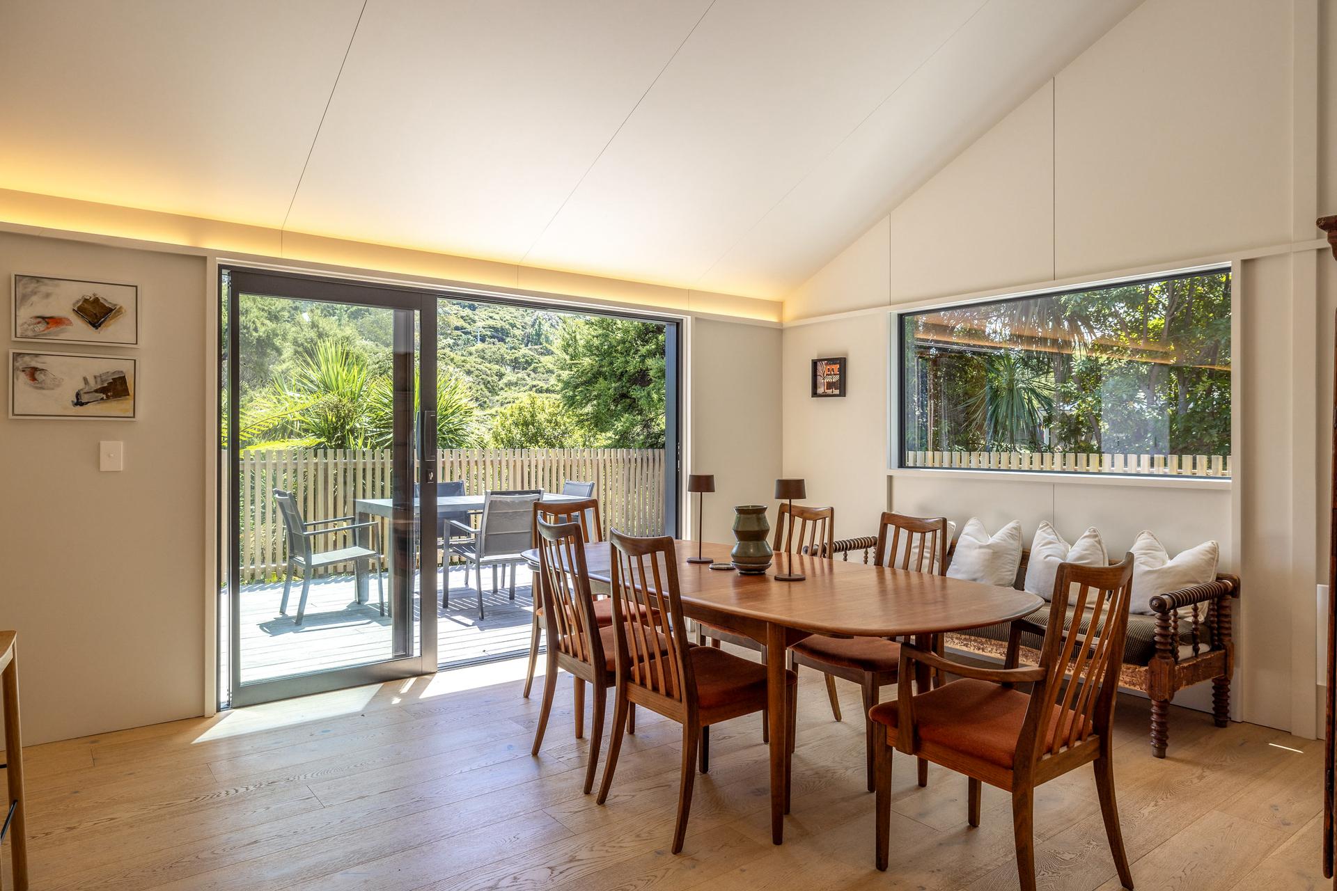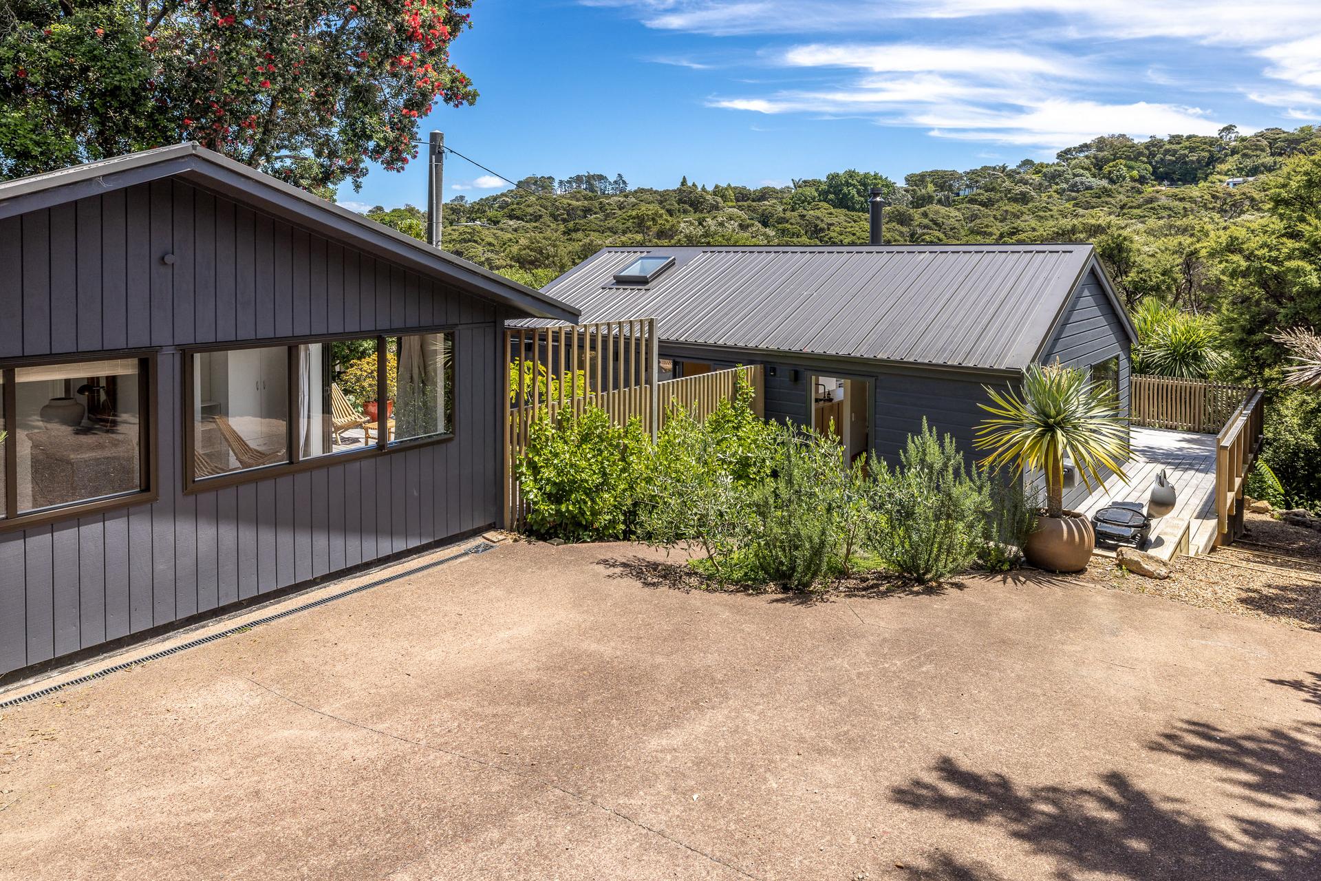 The fully refreshed main house features a bright open-plan living and dining area that flows effortlessly onto sun-soaked decks surrounded by native greenery. With one bedroom plus a versatile den.