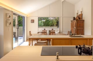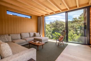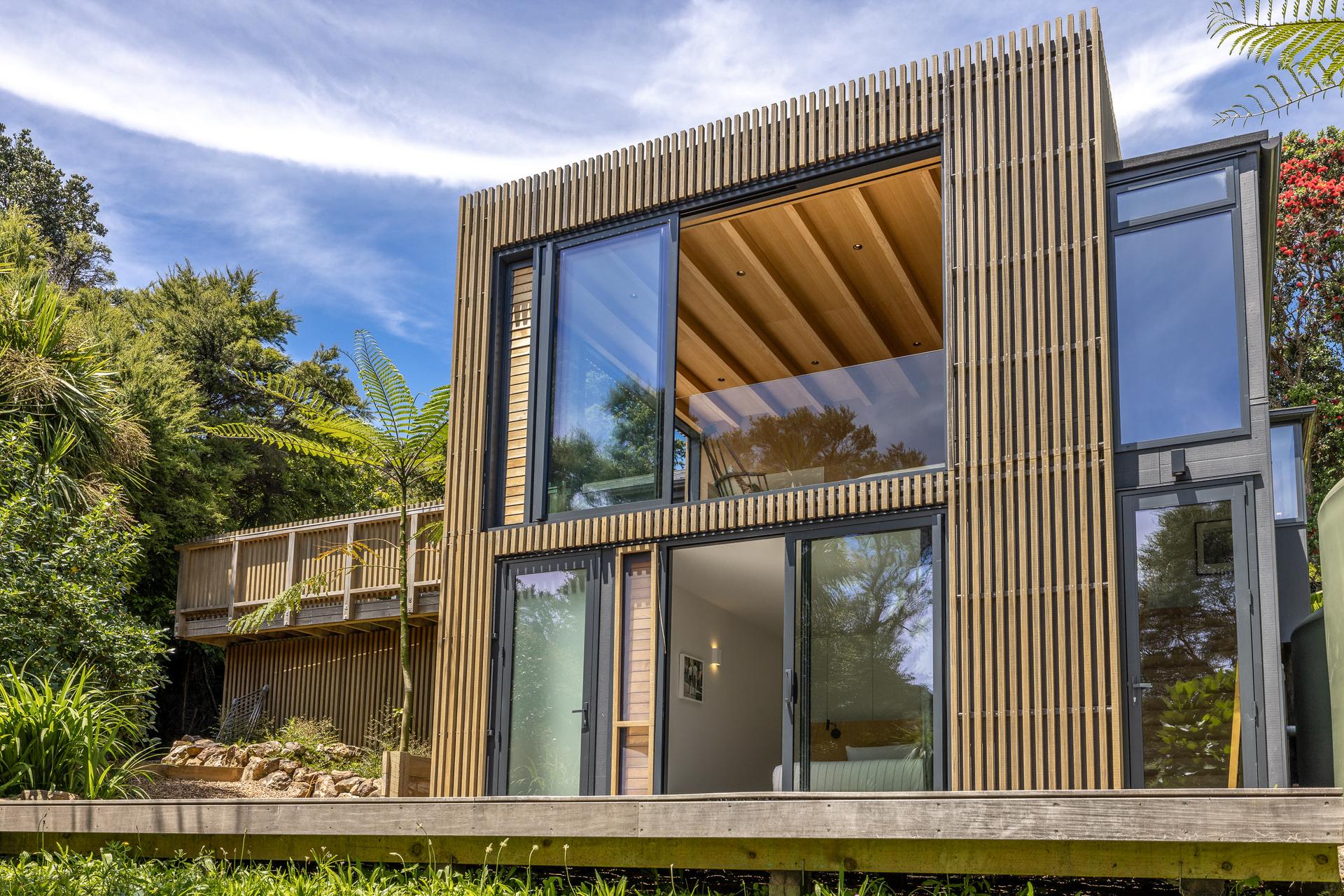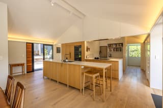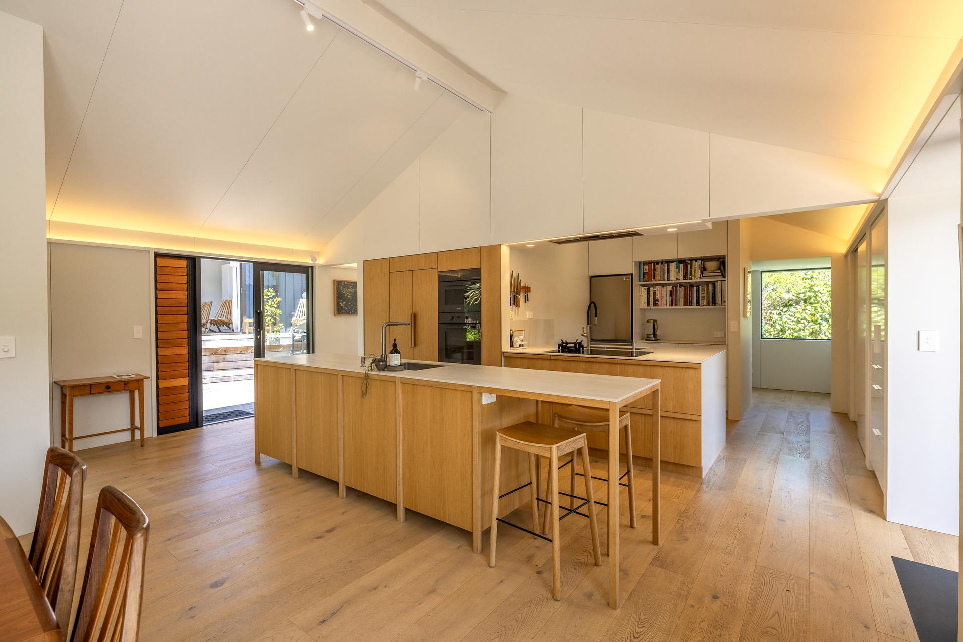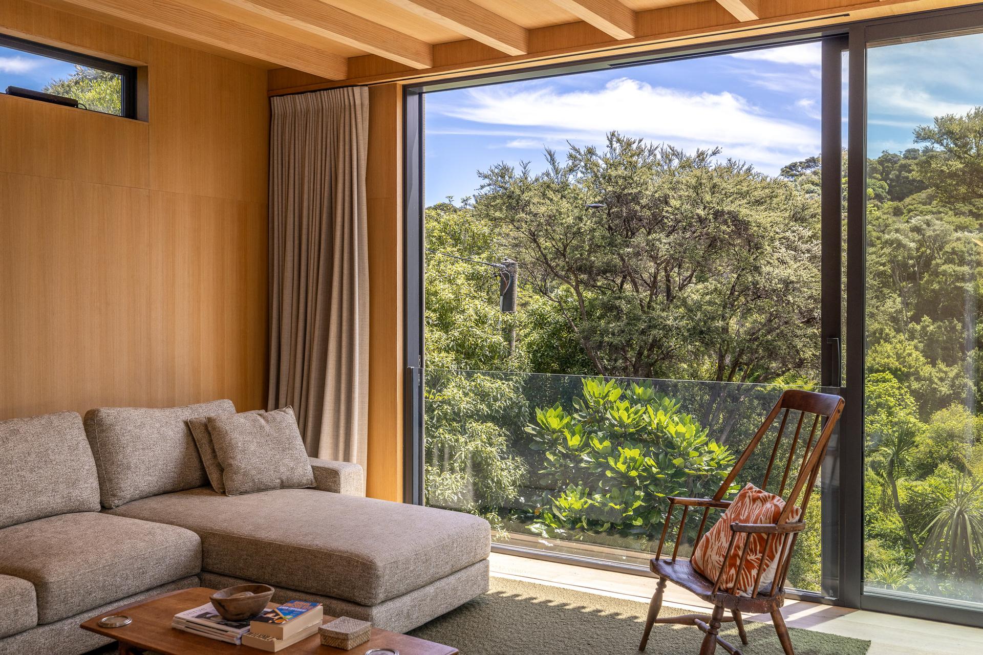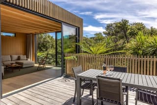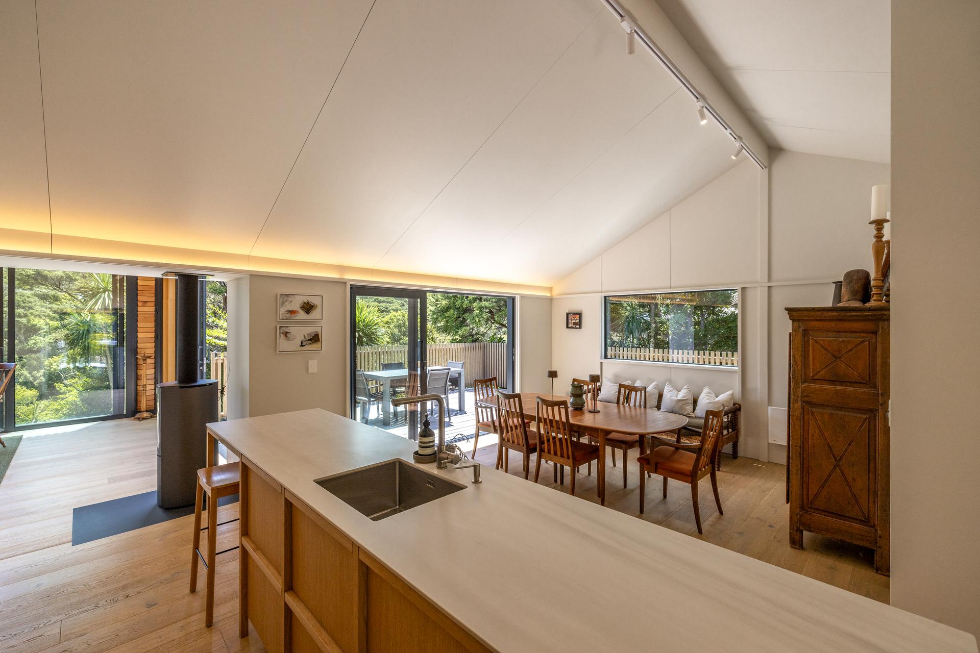 The fully refreshed main house features a bright open-plan living and dining area that flows effortlessly onto sun-soaked decks surrounded by native greenery. With one bedroom plus a versatile den.