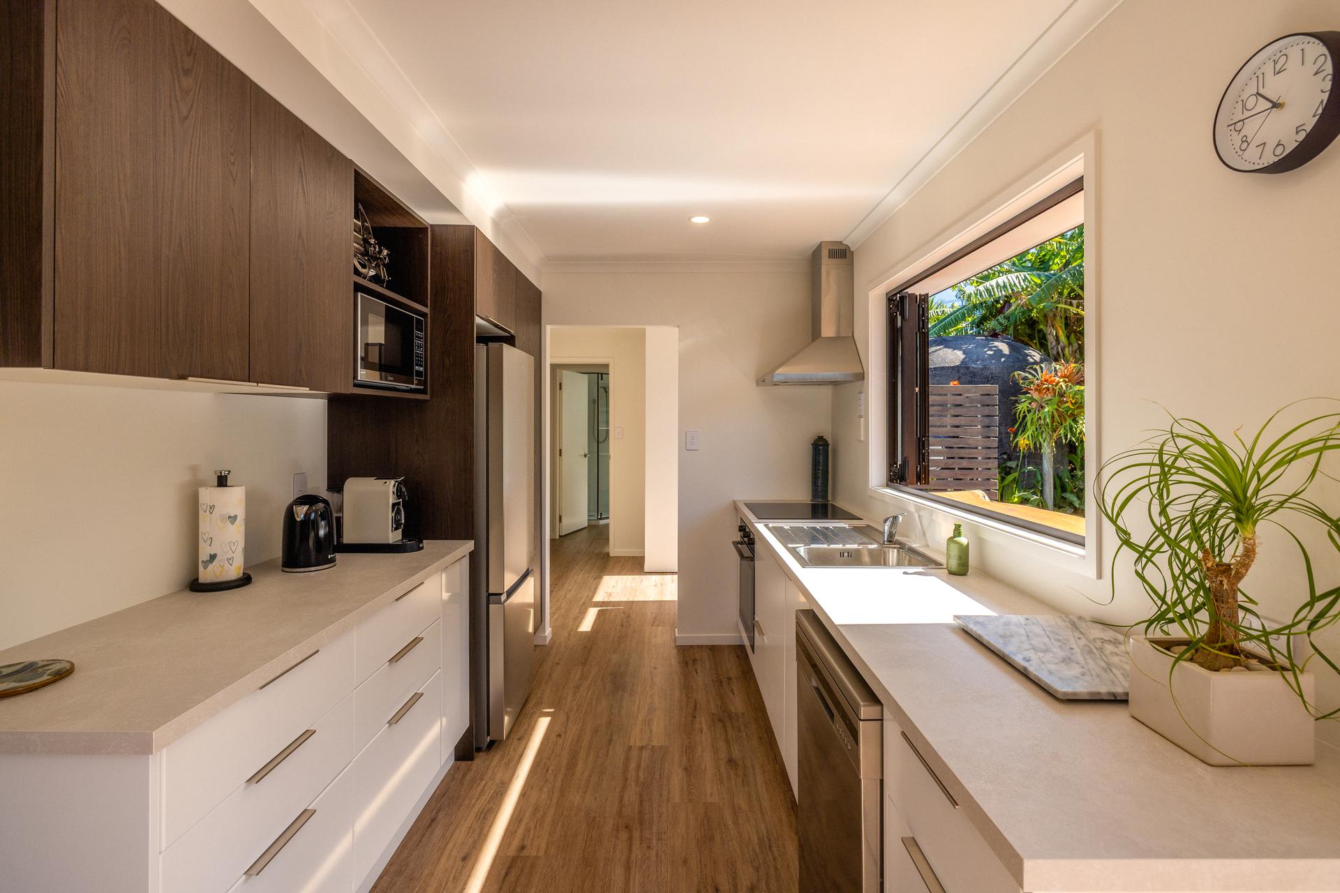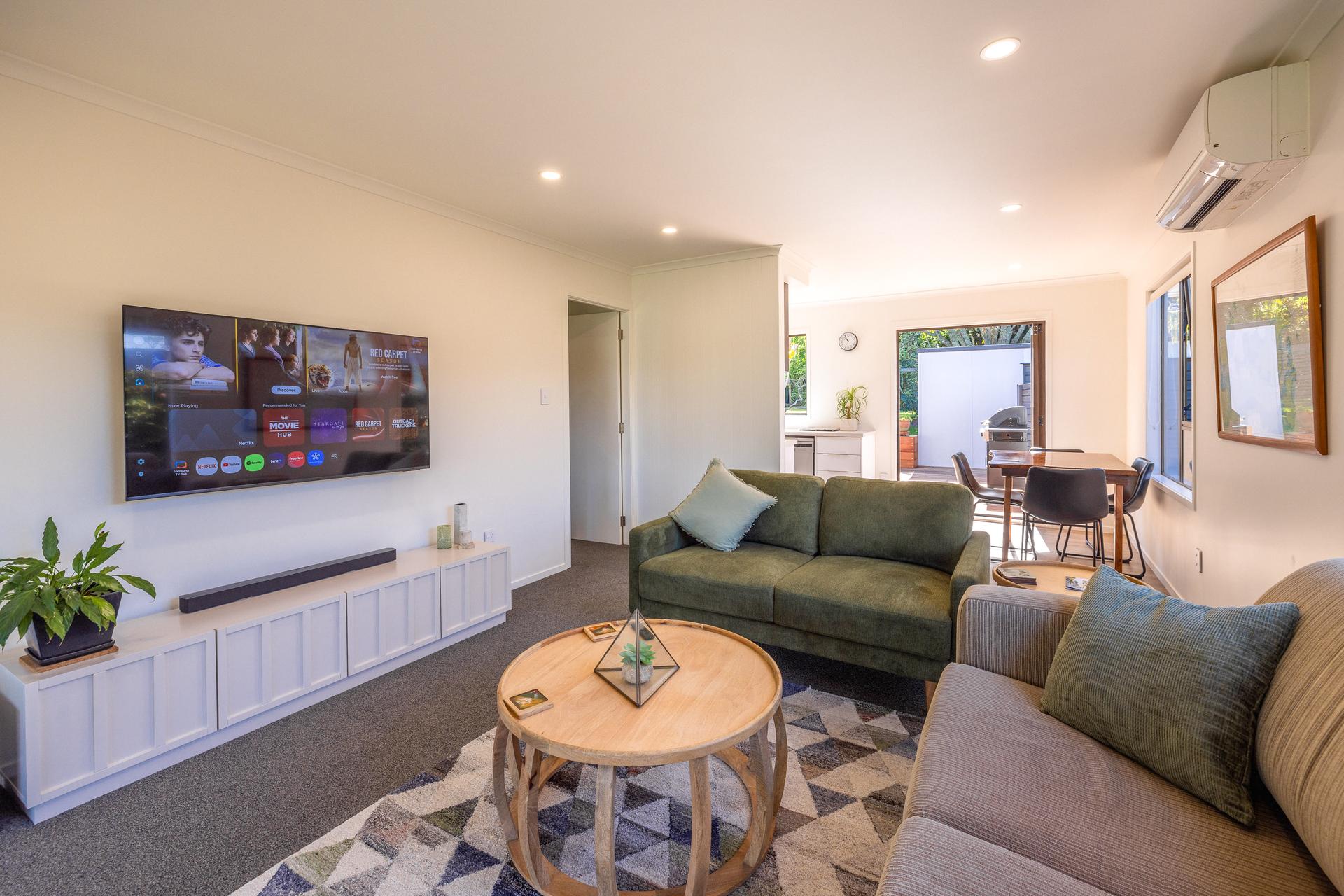 The kitchen is fully equipped for self-catering, whether you're preparing a relaxed brunch or a long dinner featuring Waiheke’s beautiful local produce. Comfortable seating, a Smart TV, and heating for cooler evenings ensure Cabbage Tree Cottage is a cosy destination in every season.