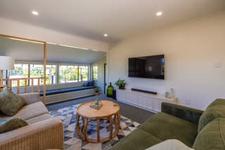 Step inside to a light-filled, open-plan living, dining and kitchen space designed for easy holiday living. Large windows welcome in natural light, creating a warm and airy atmosphere throughout the day. The living area flows seamlessly outdoors, where you can enjoy your morning coffee or an evening glass of local wine while soaking up the peaceful surroundings.