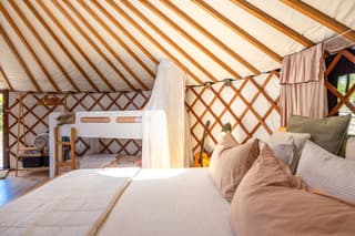 The yurt is designed to immerse you in the natural beauty of the surroundings. The roof is ingeniously designed to be opened, providing an extraordinary experience of sleeping beneath the stars or basking in the warmth of the sun during the day.